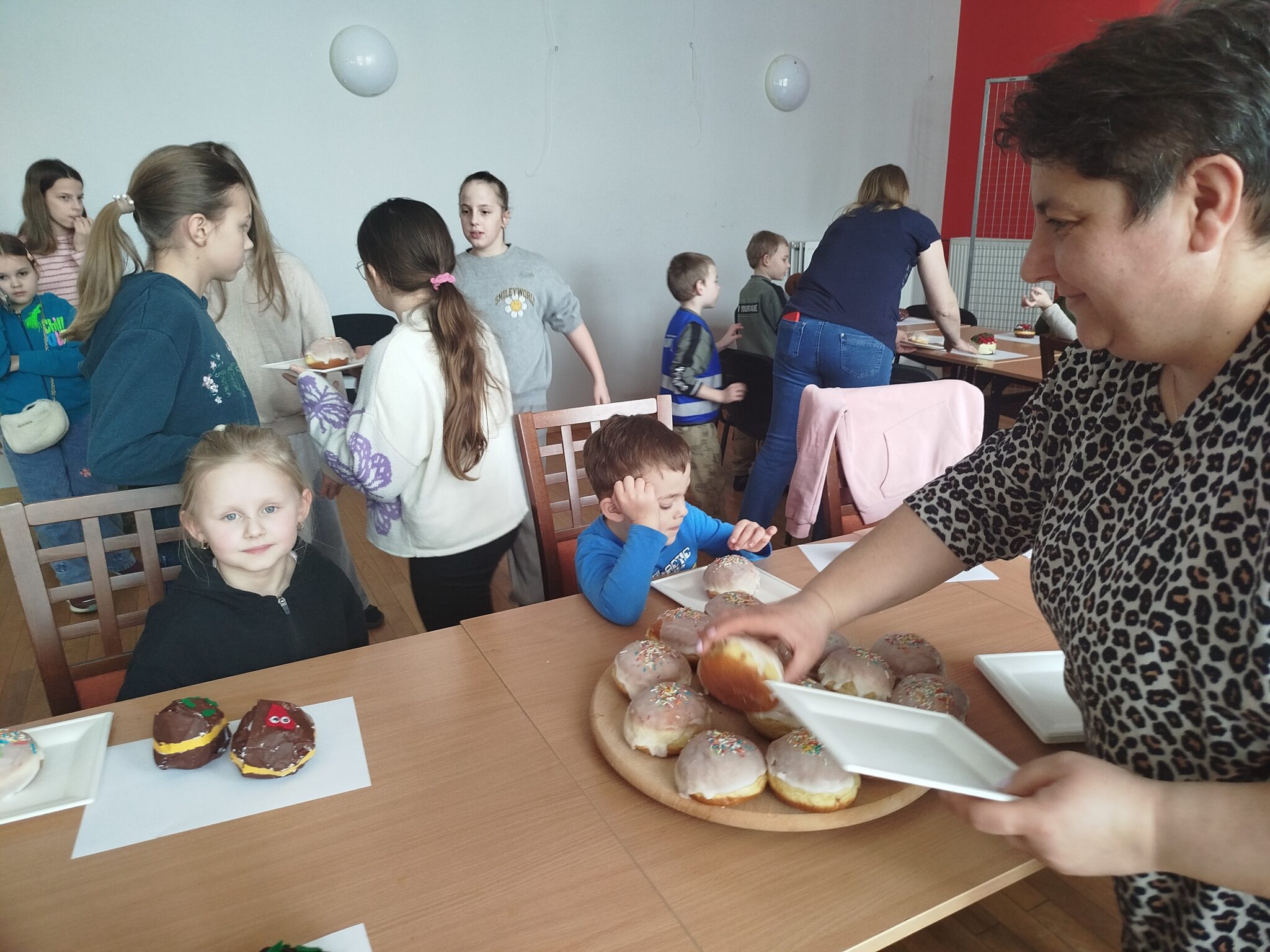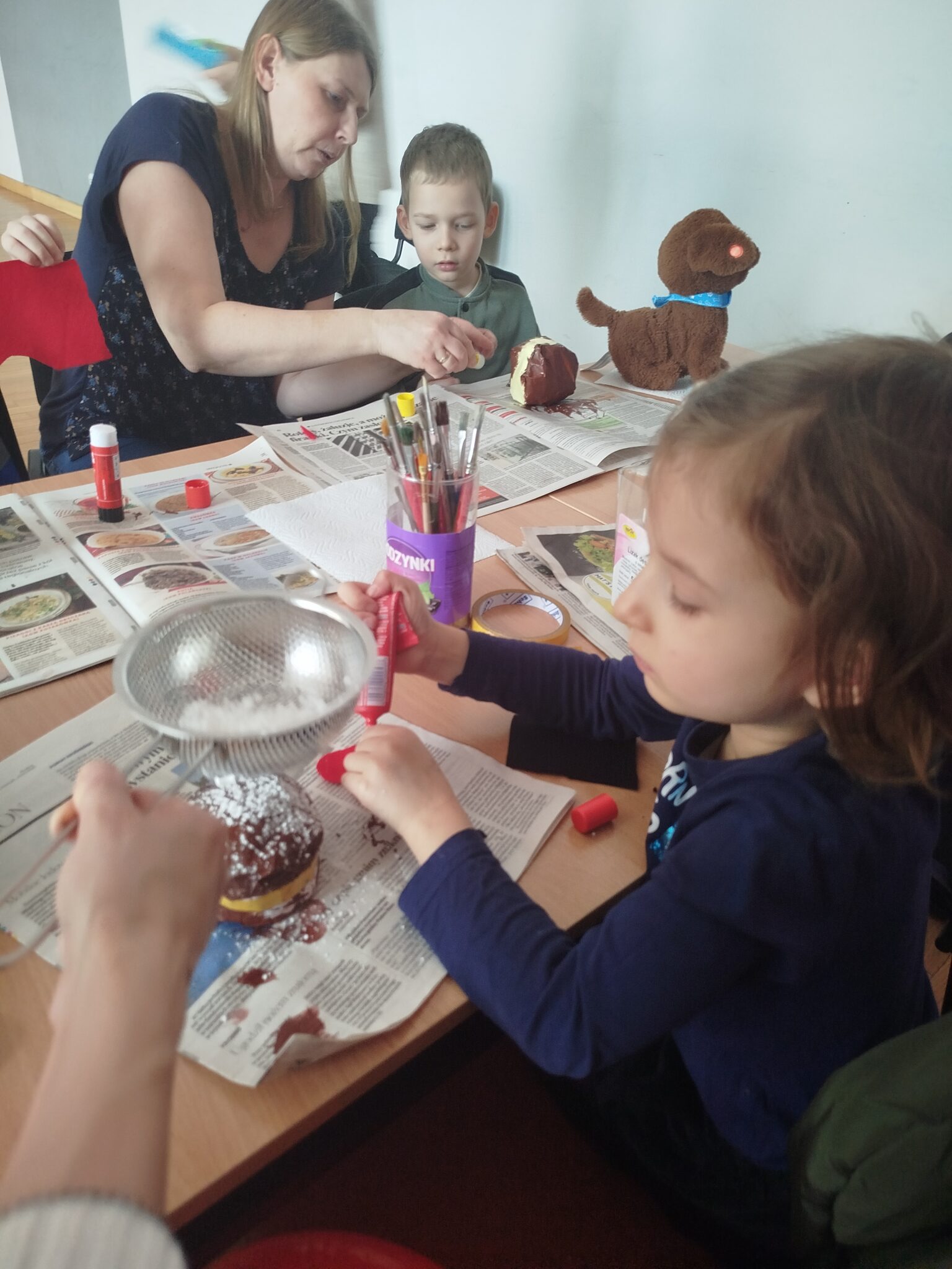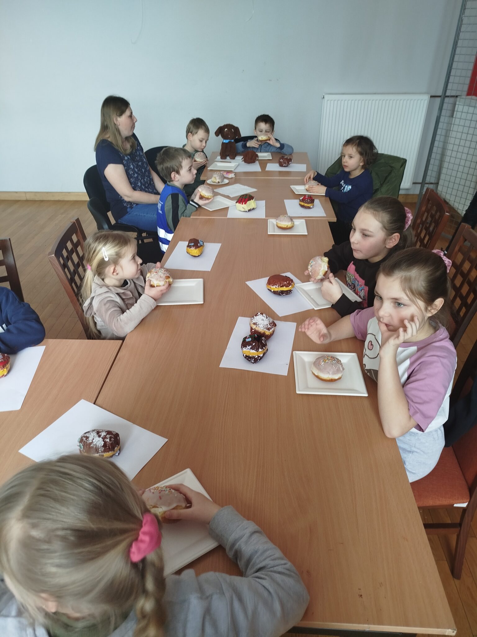 Dzieci wykonały piękne prace plastyczne, dekorując własne papierowe pączki. Na zakończenie zajęć wszyscy delektowali się pysznymi, słodkimi, prawdziwymi pączkami. To był smakowity dzień.