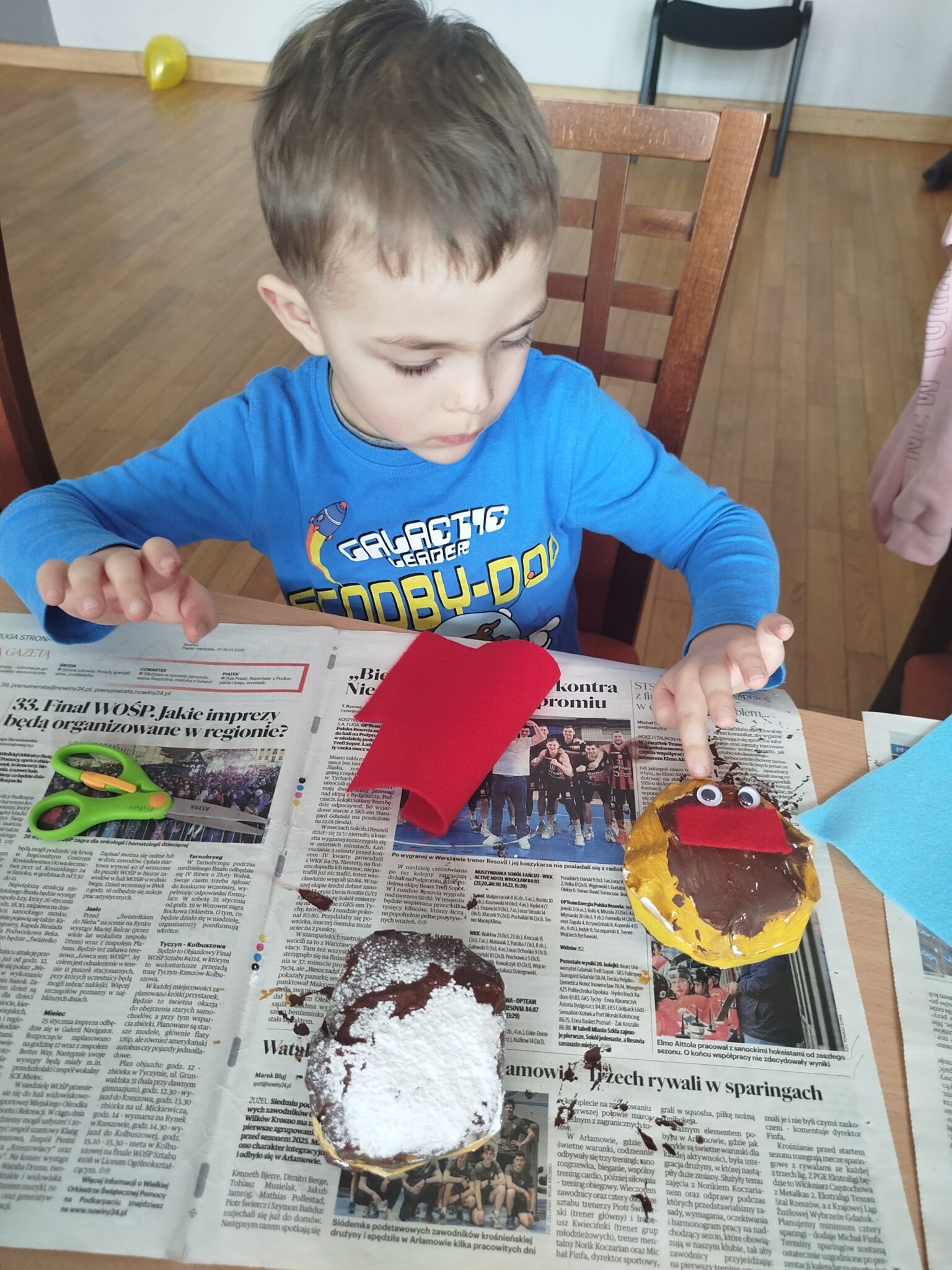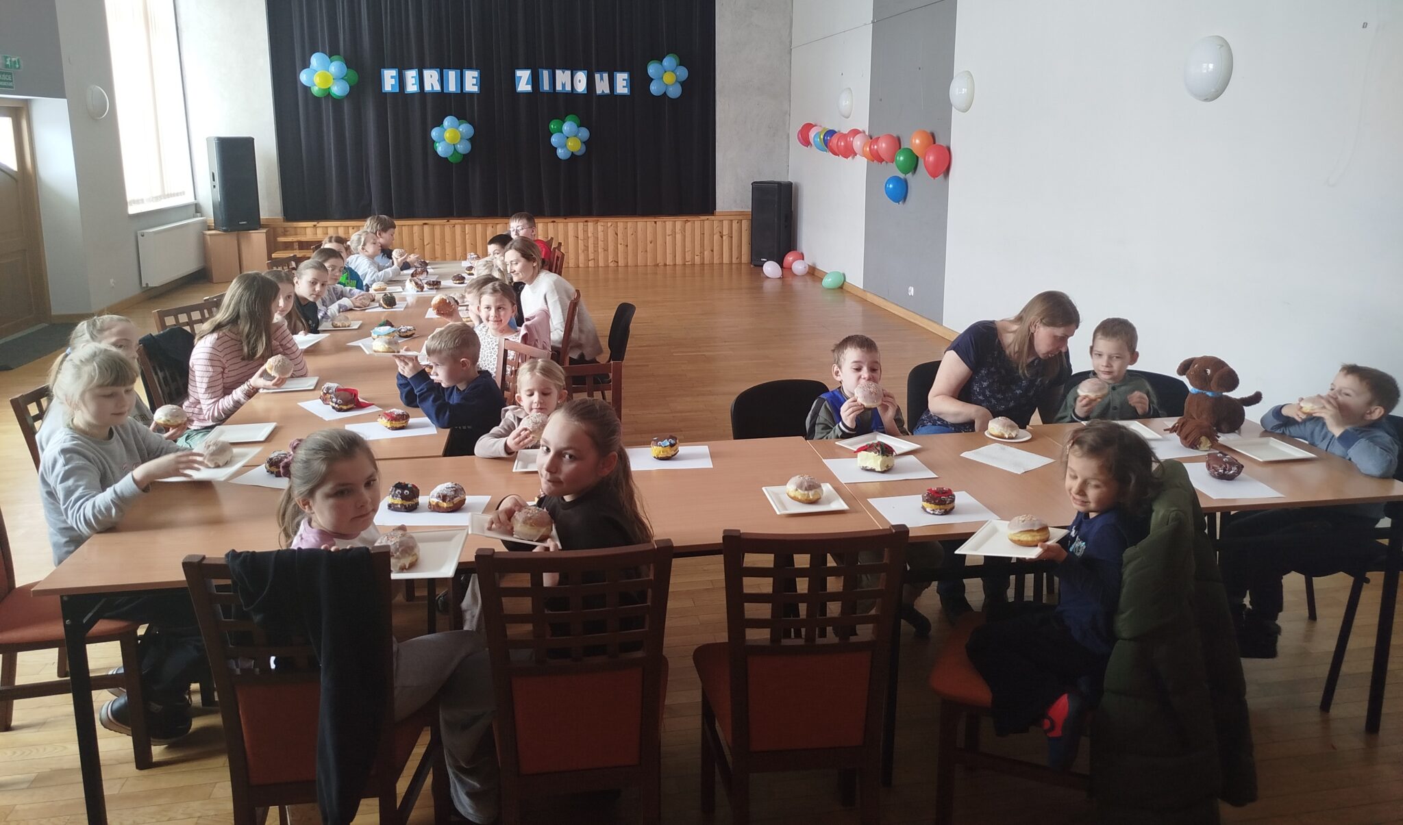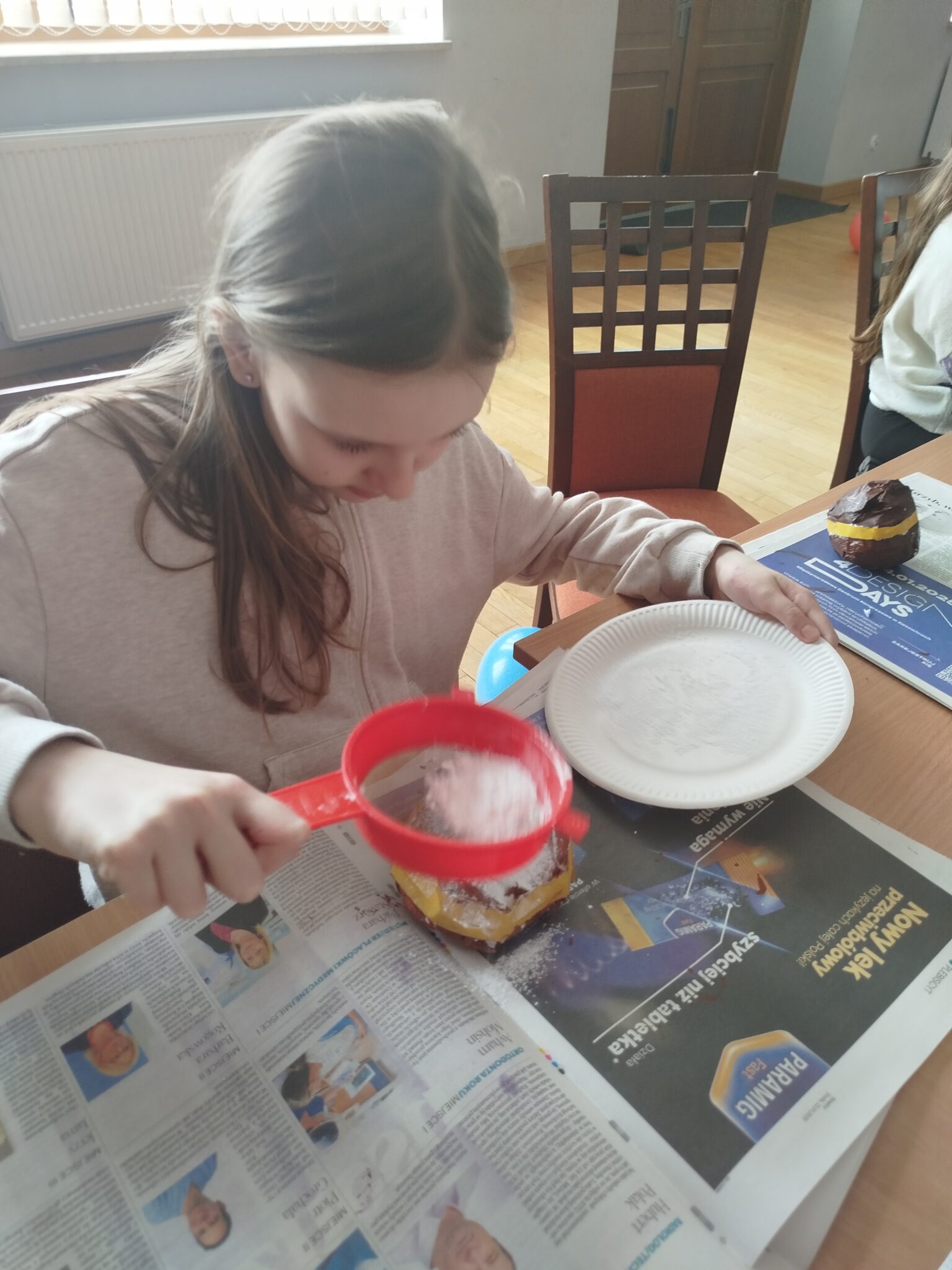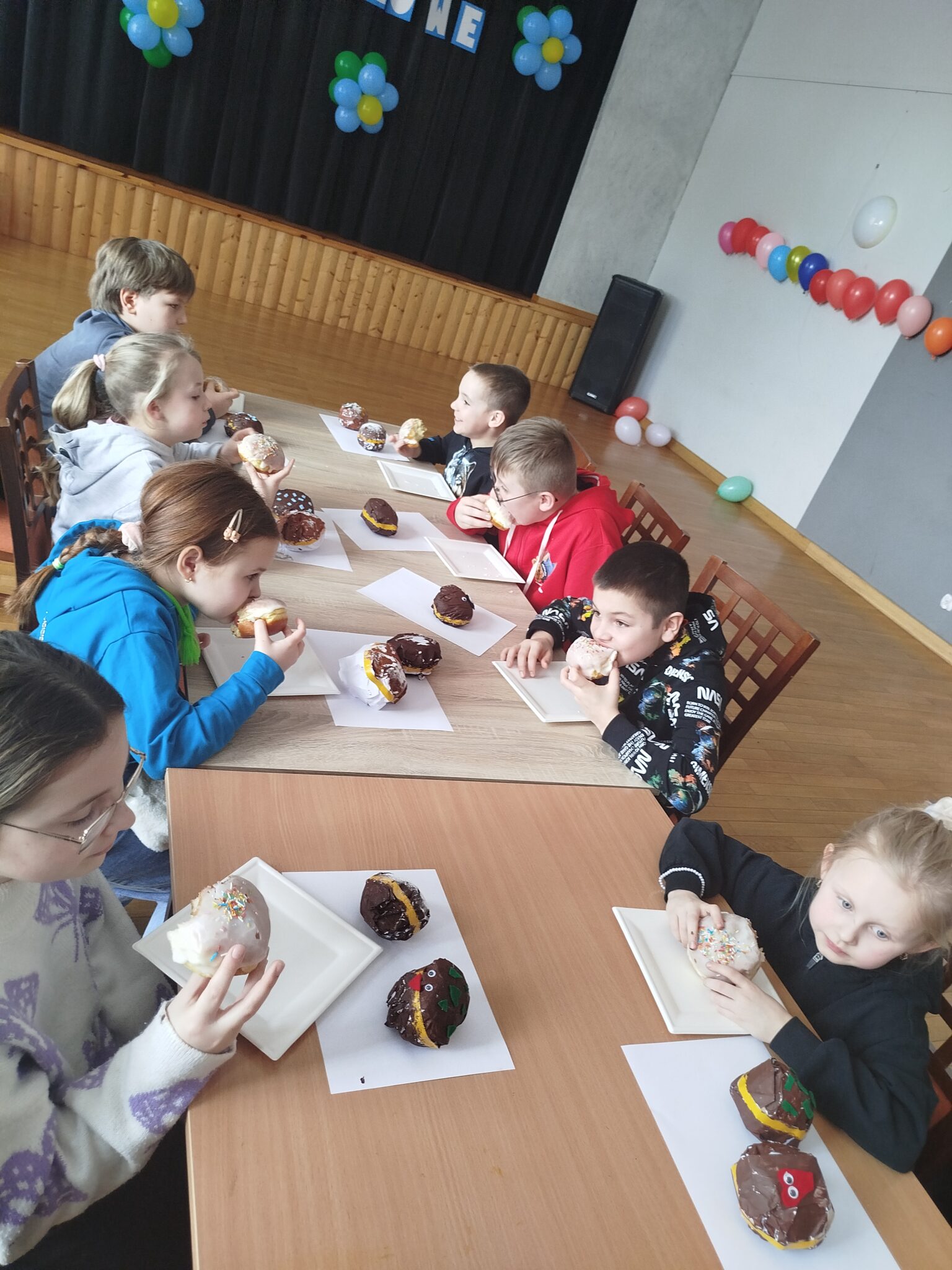 Dzieci wykonały piękne prace plastyczne, dekorując własne papierowe pączki. Na zakończenie zajęć wszyscy delektowali się pysznymi, słodkimi, prawdziwymi pączkami. To był smakowity dzień.