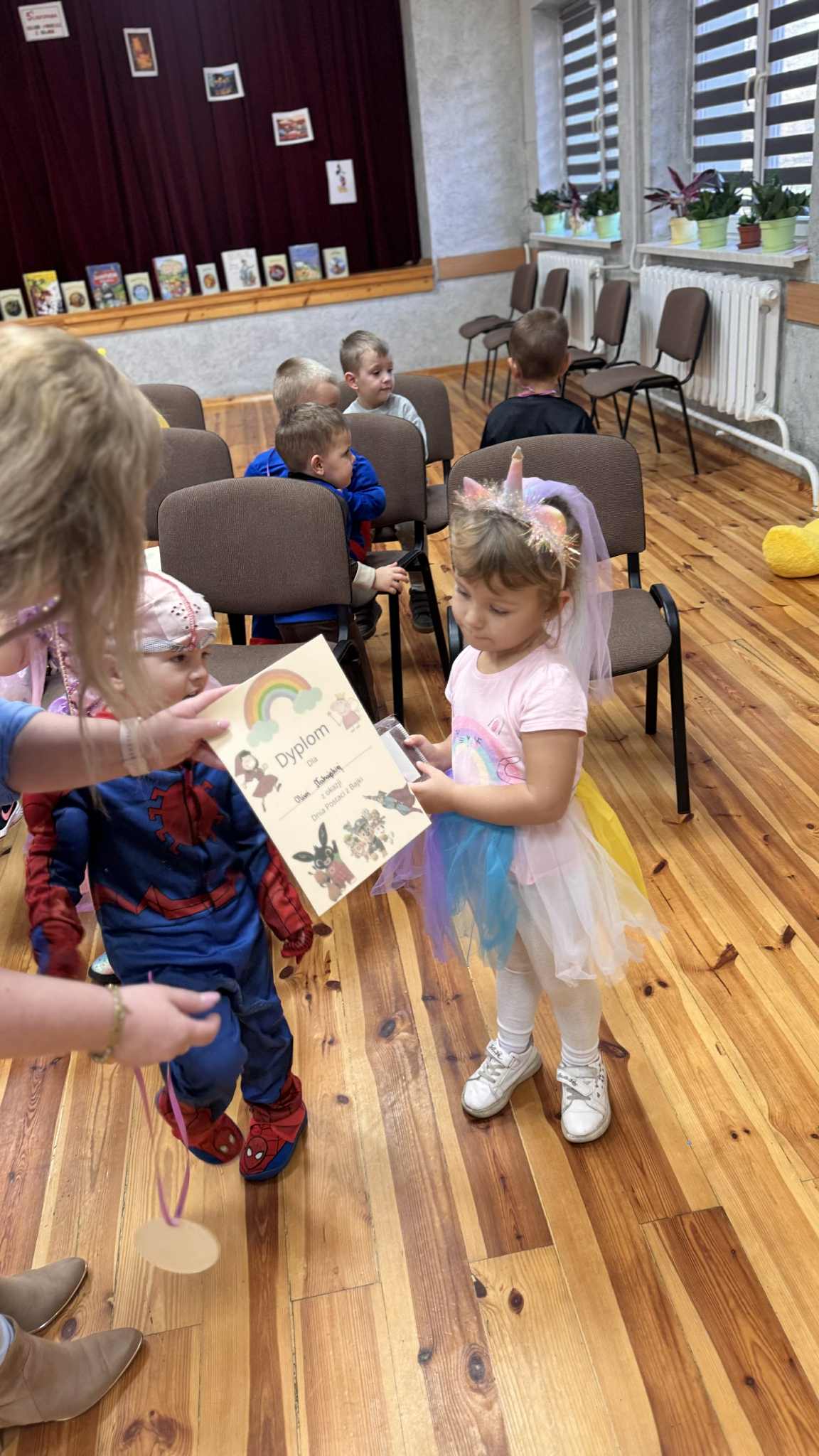 Na zakończenie mali uczestnicy otrzymali słodki upominek, pamiątkowy dyplom oraz medale z okazji Dnia Postaci z Bajek, co wywołało wiele uśmiechu i radości. Serdeczne podziękowania kierujemy do pani Gabrieli Muszyńskiej Gnatek, pani Eli oraz pani Aneta Szczepek za zaangażowanie, chęć udziału i pomoc w przygotowaniu tego wyjątkowego dnia. Dziękujemy również naszym kochanym przedszkolakom -to dzięki Wam nasz Ośrodek Kultury wypełniała bajkowa Magia!