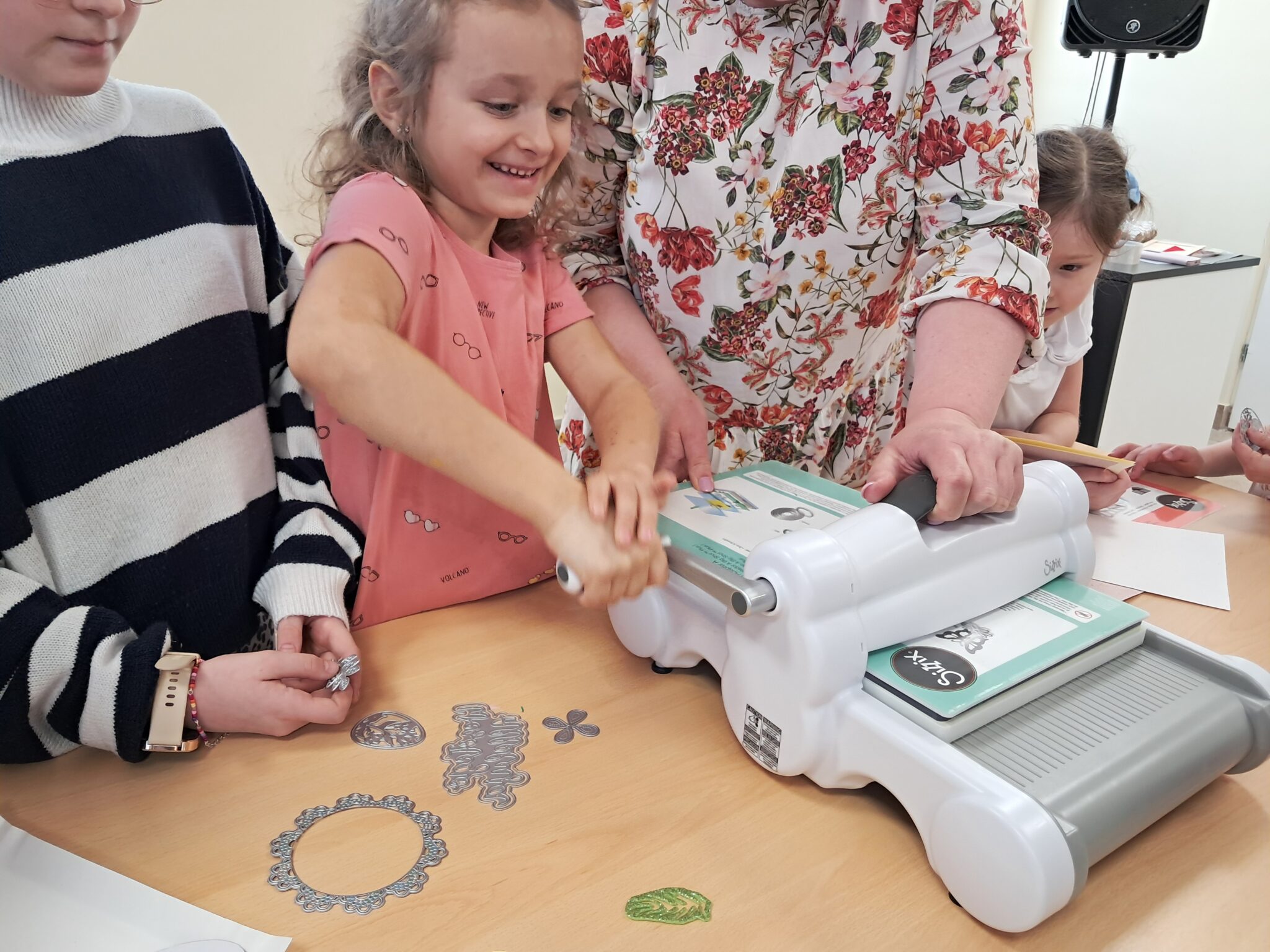 Podczas zajęć plastycznych „Kartka Wielkanocna” dzieci wykonały własnoręcznie kartki wielkanocne. Do pracy wykorzystaliśmy specjalną maszynę oraz szablony do wycinania różnych kształtów. Uczestnicy mieli okazję spróbować swoich sił w wykrawaniu z papieru oraz pianki kreatywnej pisanek, kwiatów, króliczków i motyli. Niektóre dzieci ozdabiały swoje prace małymi, styropianowymi pisankami, co dodatkowo uatrakcyjniło efekt końcowy.