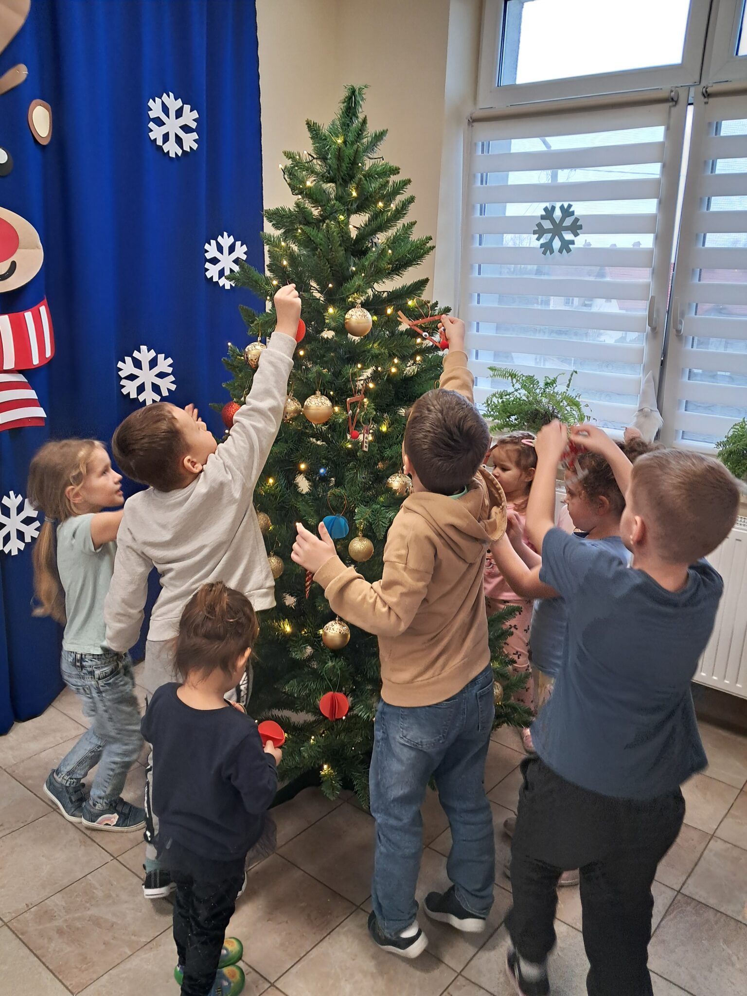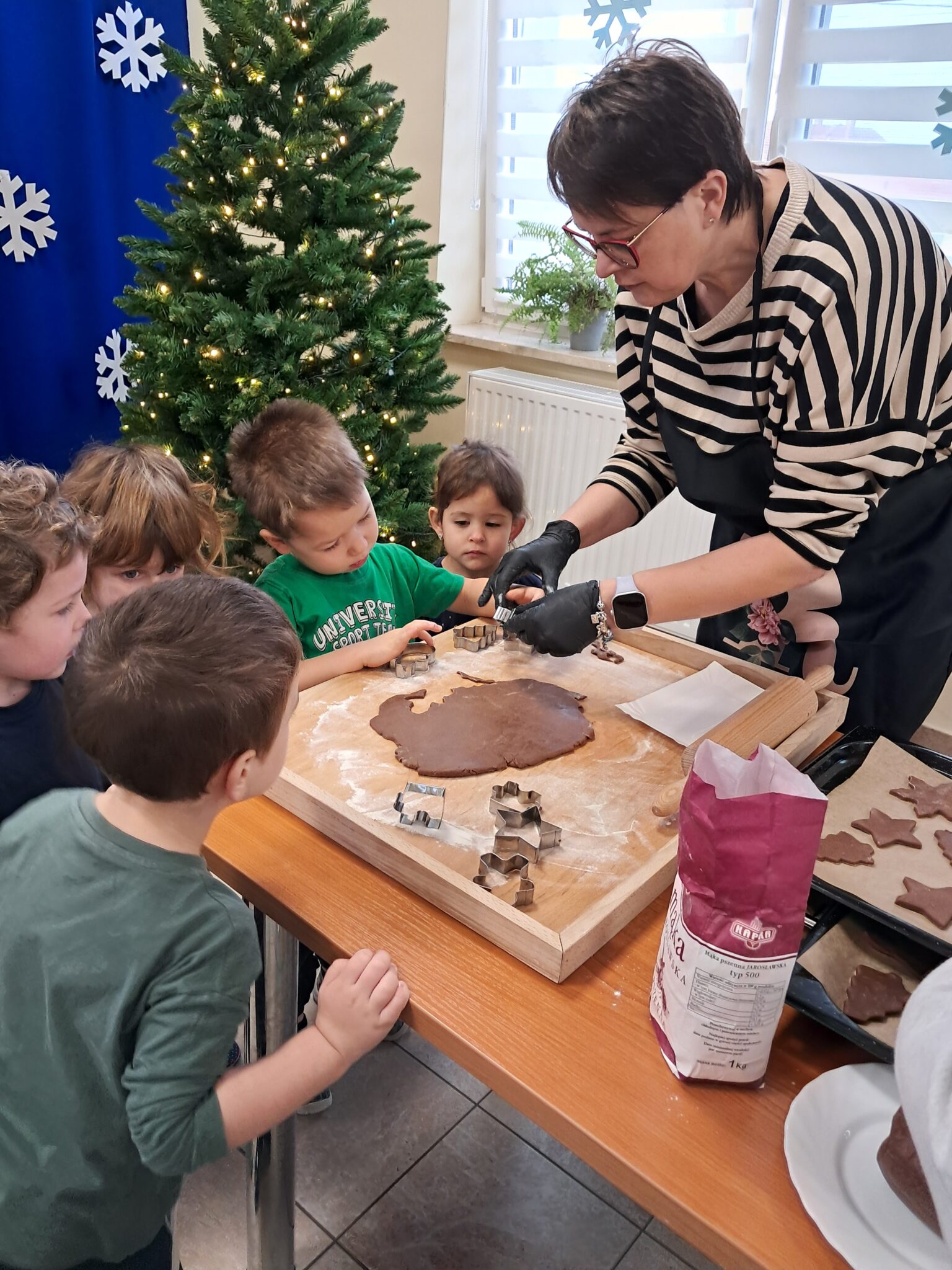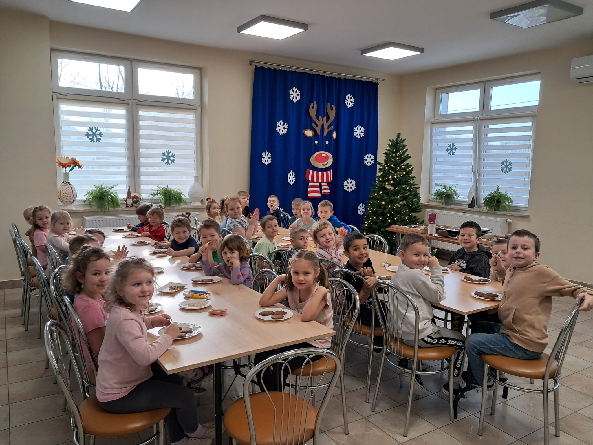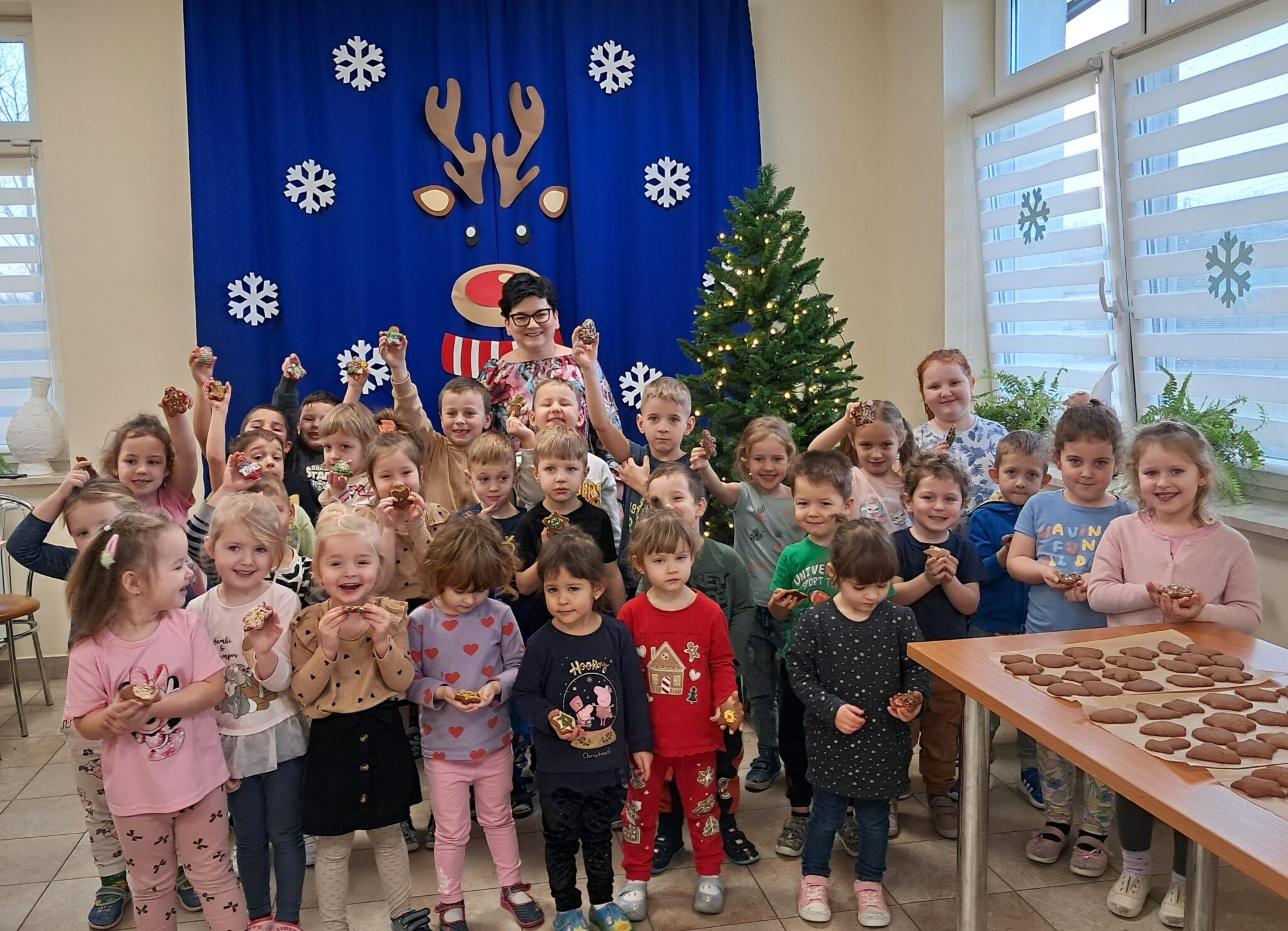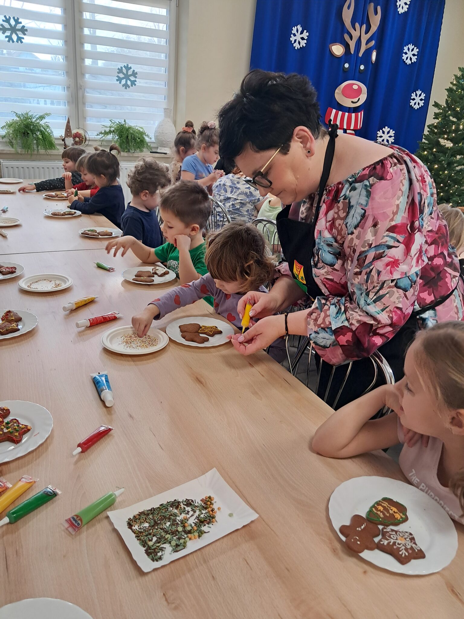 Efekty ich pracy były baaardzo apetyczne i niezwykle urocze — aż trudno było się oprzeć pokusie spróbowania. Nawet renifer z naszej dekoracji przyglądał się z ogromny apetytem na te świąteczne smakołyki! Na końcu zajęć dzieci dekorowały choinkę. Wieszanie bombek i innych ozdób sprawiło najmłodszym wiele radości i było, podobnie jak pieczenie i dekorowanie pierników, pięknym elementem kultywowania bożonarodzeniowych zwyczajów.