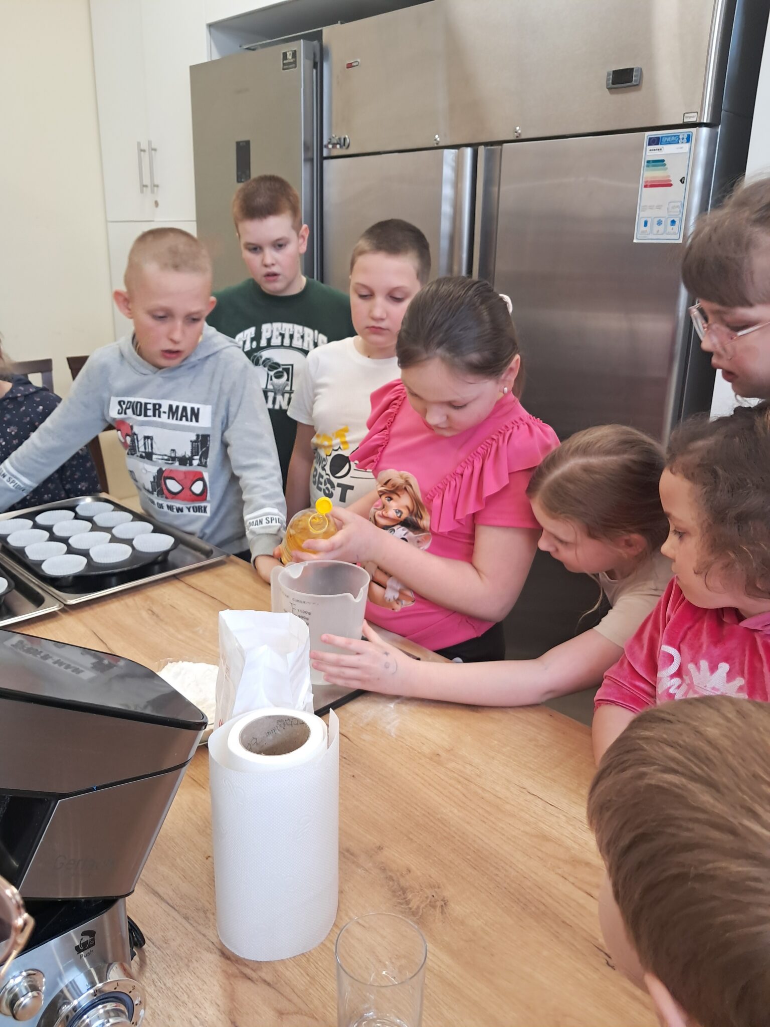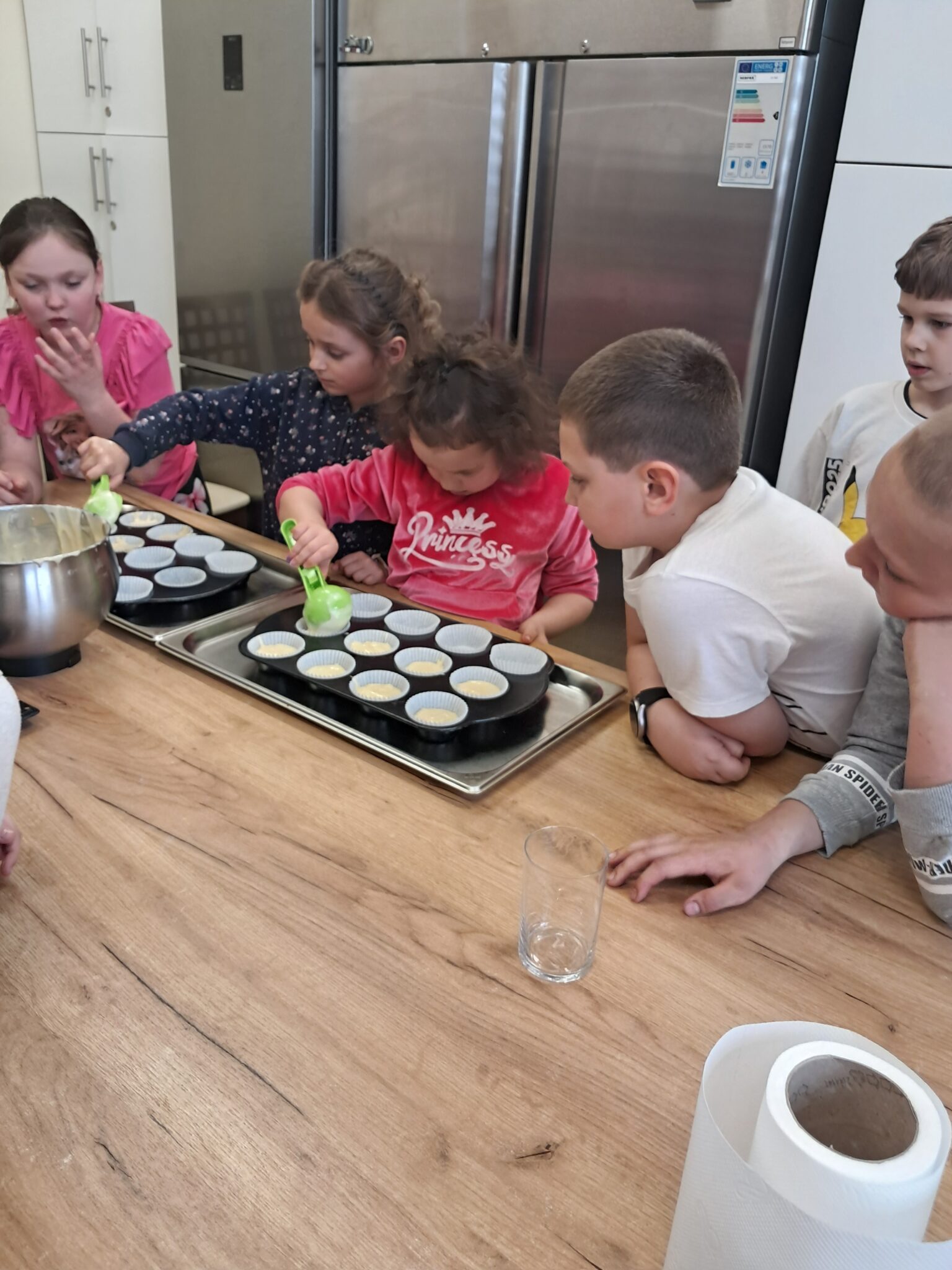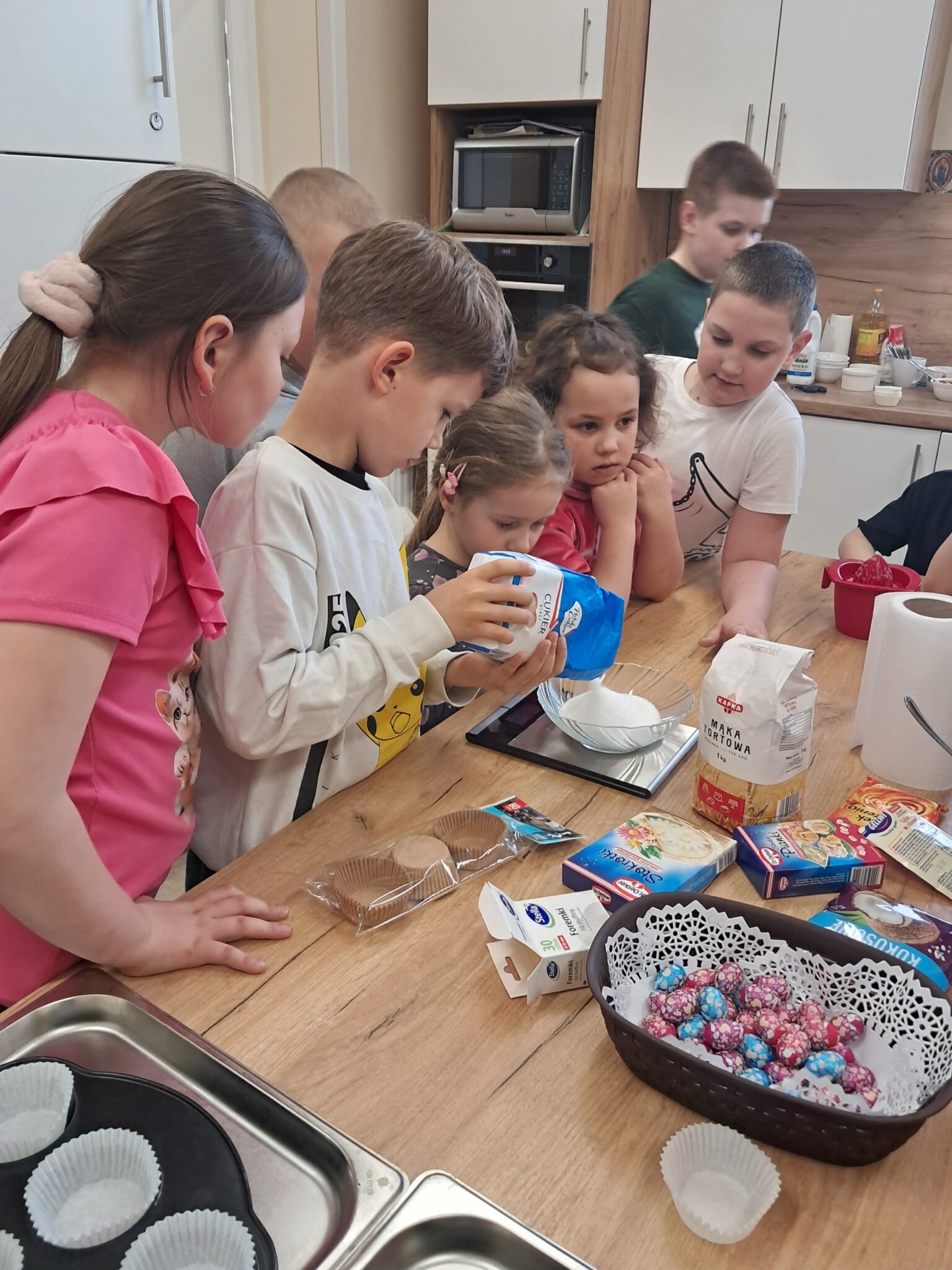 Dzieci z dużym zaangażowaniem wykonywały wszystkie etapy pracy – od rozbijania jajek, przez odmierzanie składników na wadze, po przygotowanie foremek i nakładanie ciasta.