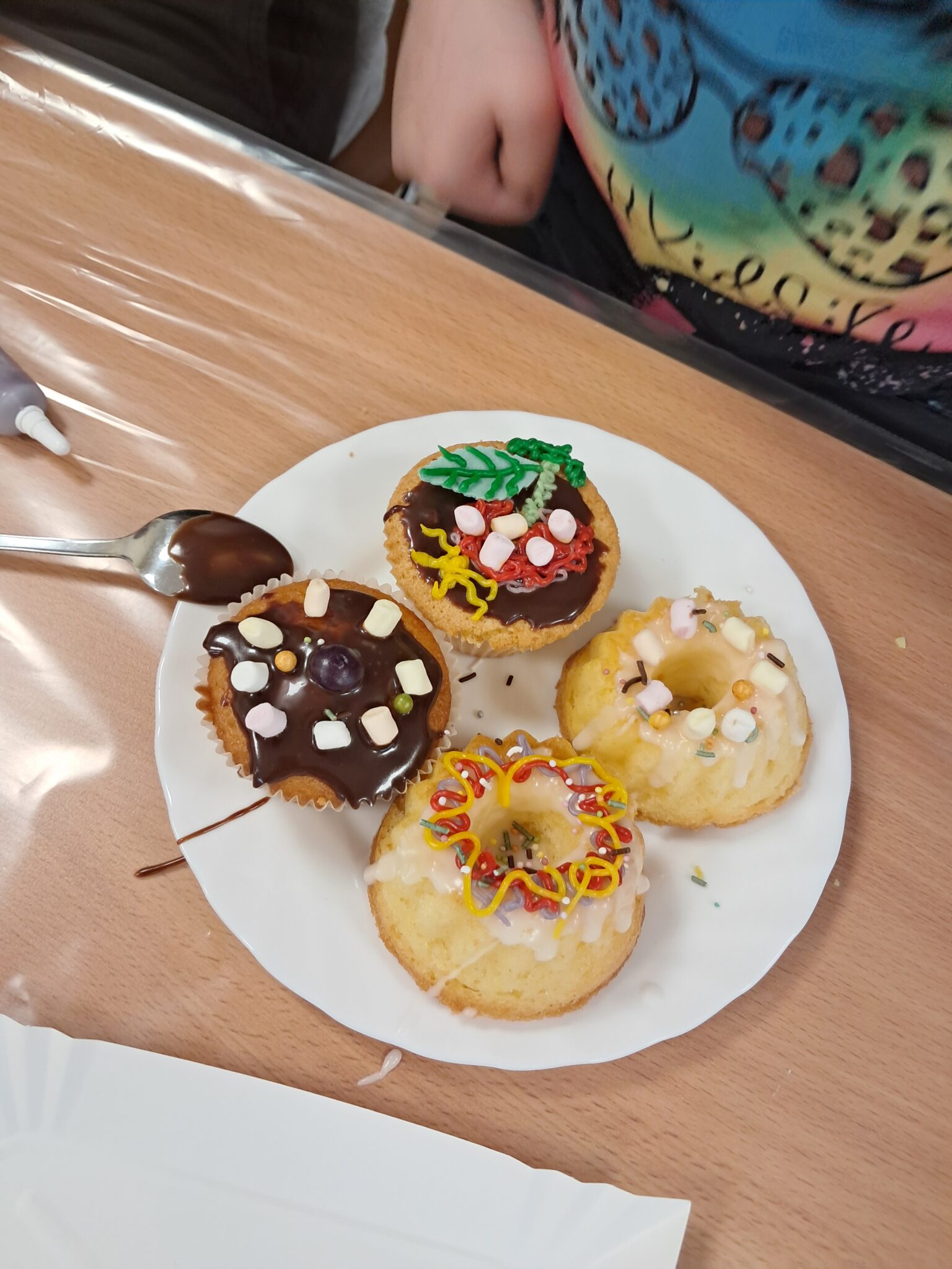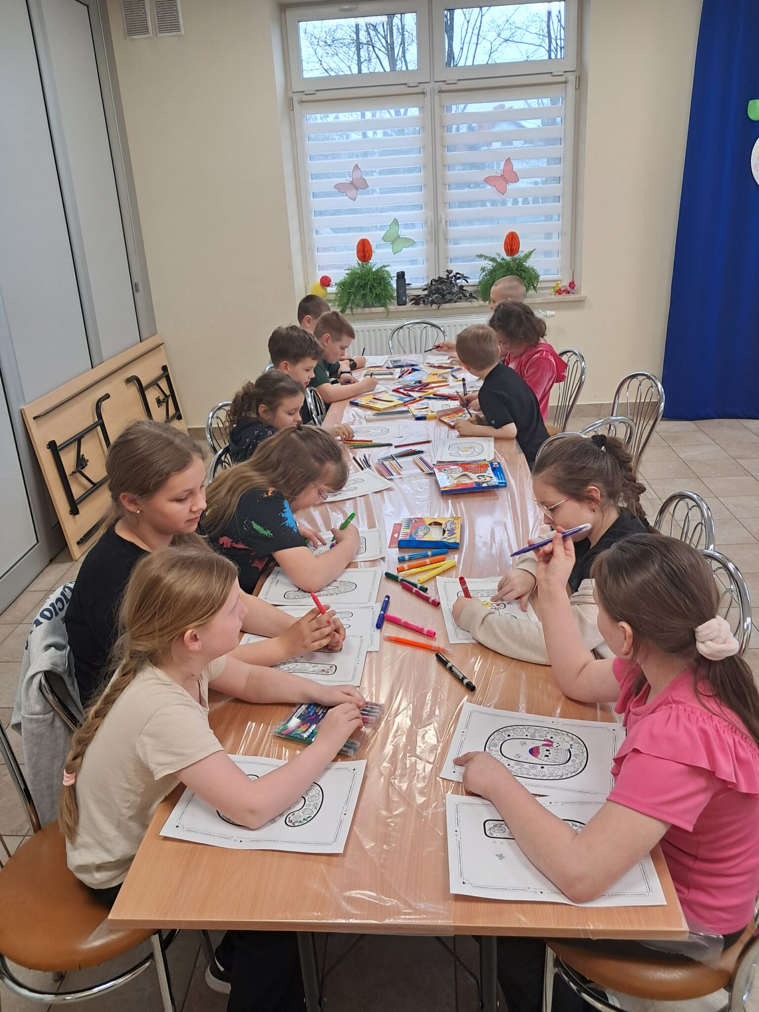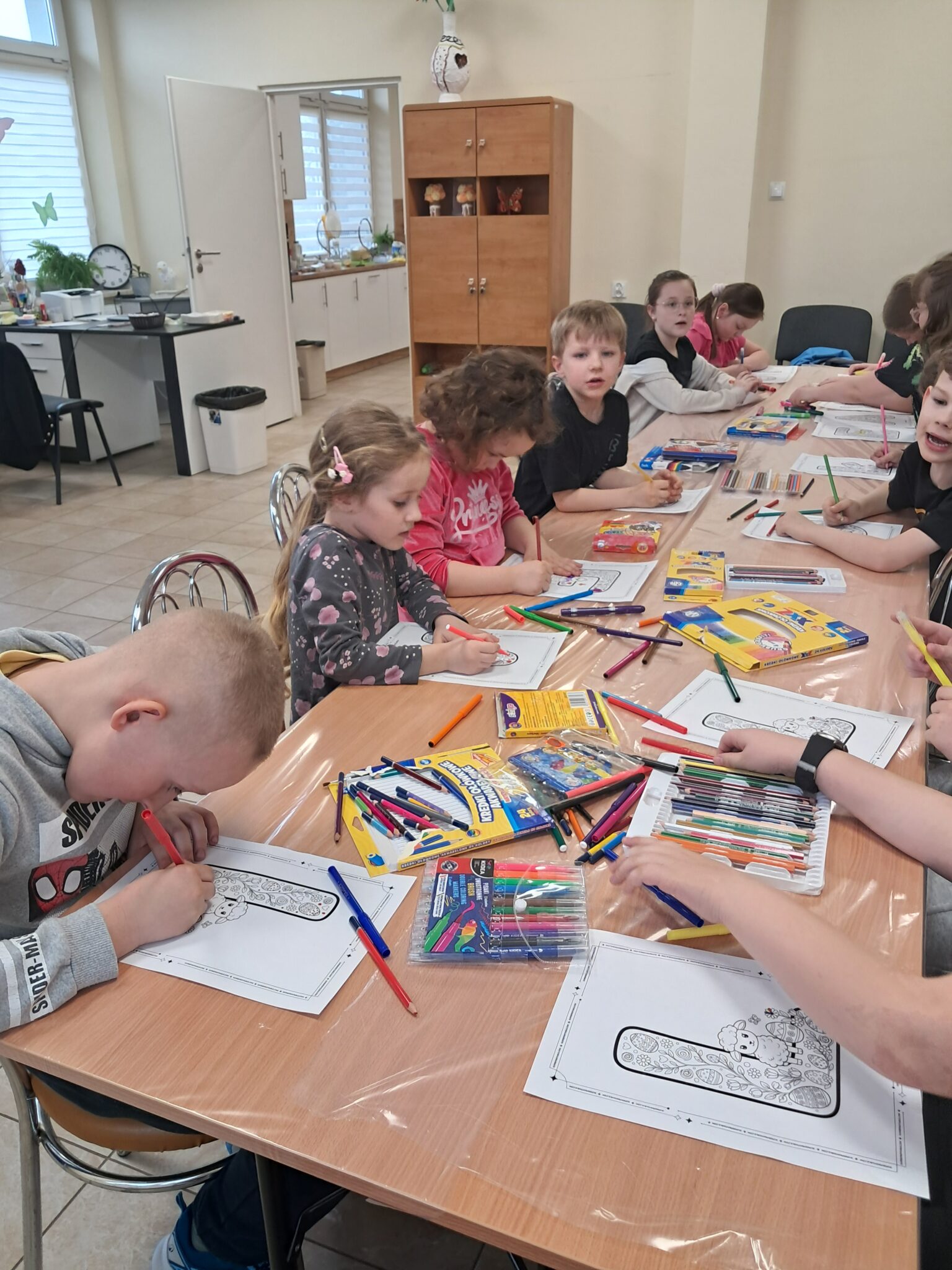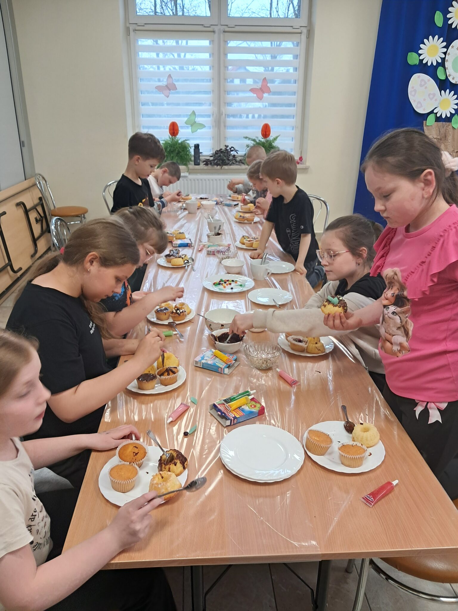 Czas oczekiwania na wypiek został twórczo wykorzystany – dzieci kolorowały duże litery tworzące napis „Wesołego Alleluja”, przygotowując tym samym świąteczne życzenia. Po upieczeniu babeczek przyszedł moment na najbardziej wyczekiwaną część – dekorowanie. Czekolada, lukier i różnorodne posypki pozwoliły każdemu stworzyć własne, wyjątkowe dzieło.
